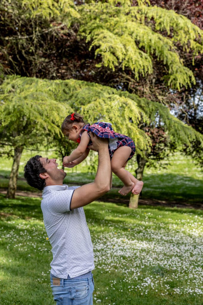 Y si estás pensando que papá no es de los que disfrutan delante de la cámara, tranquila, eso también forma parte de la experiencia. En una sesión de fotos no buscamos poses forzadas ni sonrisas poco naturales, sino momentos reales, gestos auténticos y esa conexión tan bonita que surge cuando simplemente os dedicáis a estar juntos. La idea es que papá se sienta cómodo, sin presión, casi como si estuviera compartiendo un rato especial con sus hijos. Porque cuando se relaja, cuando se olvida de la cámara y se centra en abrazar, jugar o mirar a sus pequeños, es cuando aparecen las imágenes más emotivas y verdaderas.